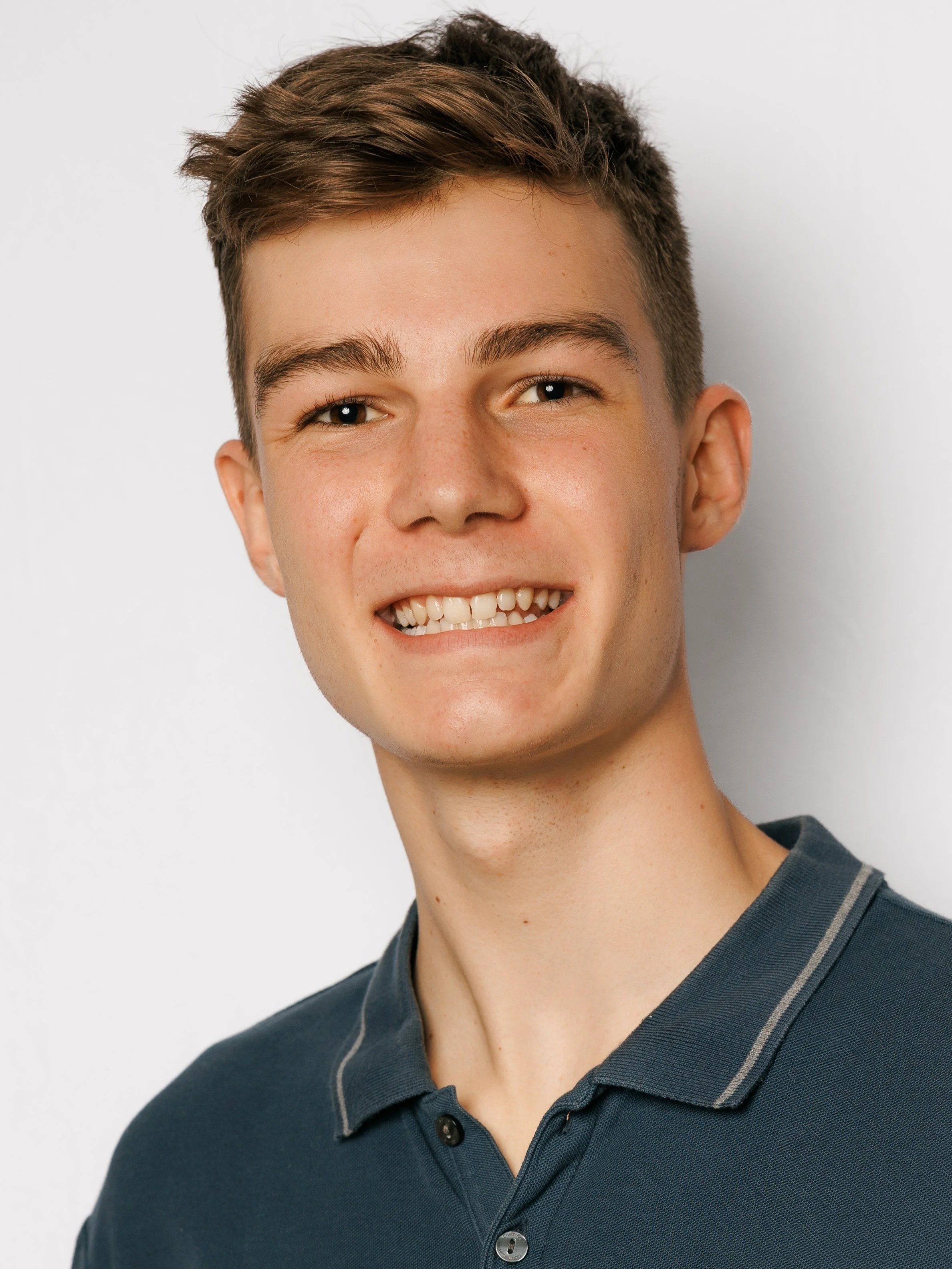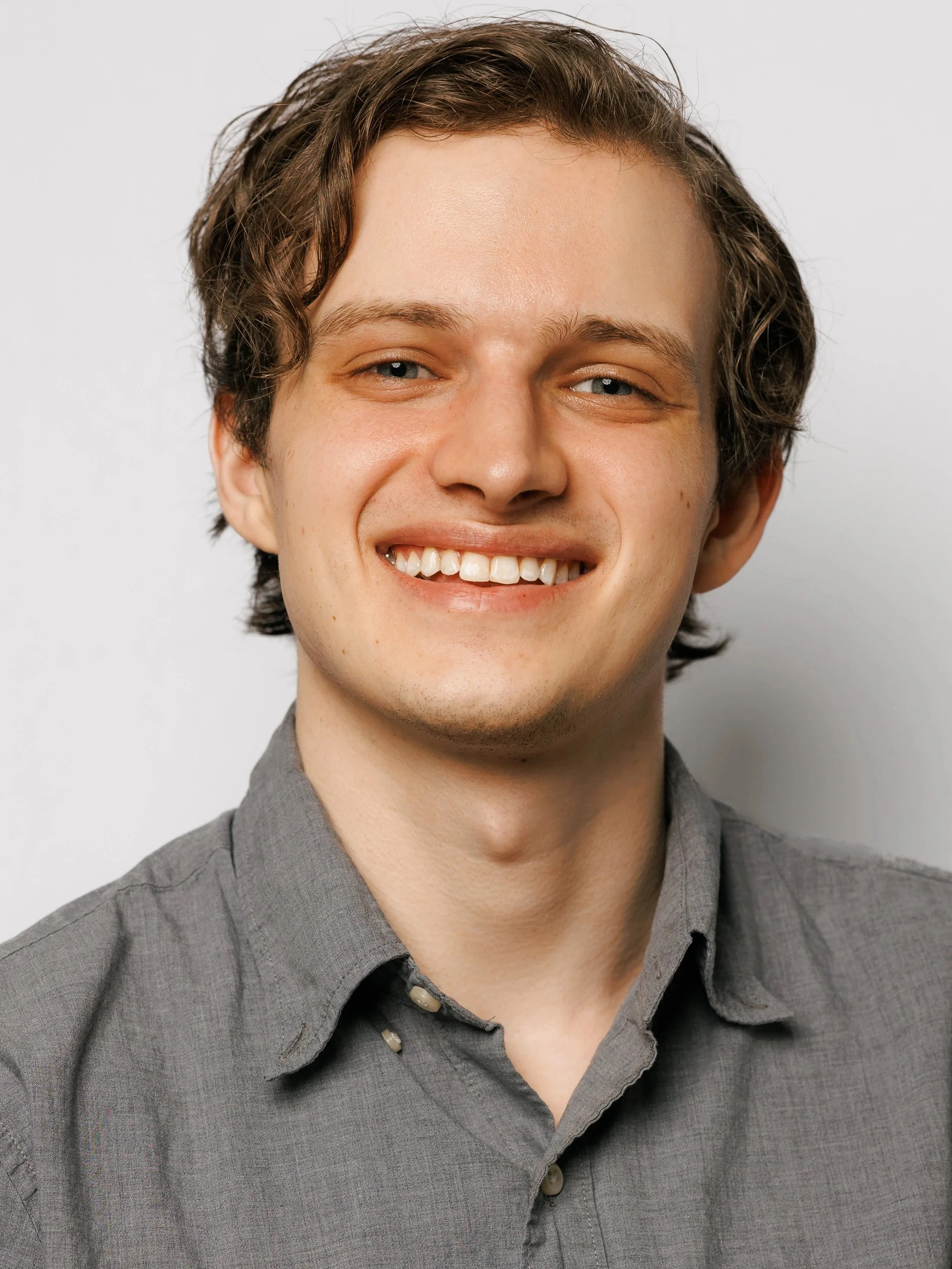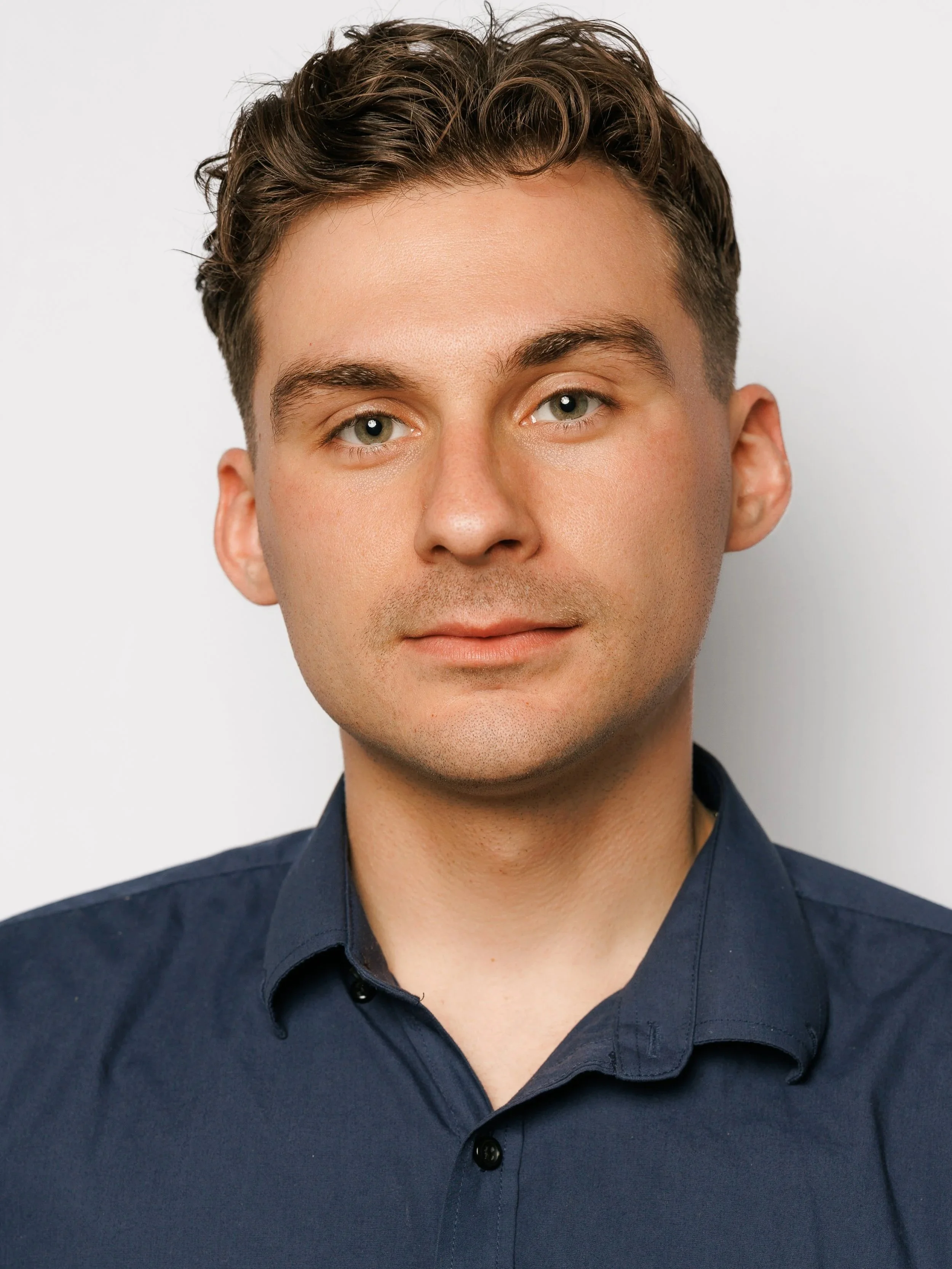 • A man with black curly hair, glasses, and a beard, smiling, wearing a dark blue polo shirt with a small logo on the left chest, standing in front of a white backdrop with red and blue logos for Ascend Music Studios, with his right hand in his pocket and left hand resting on his hip.